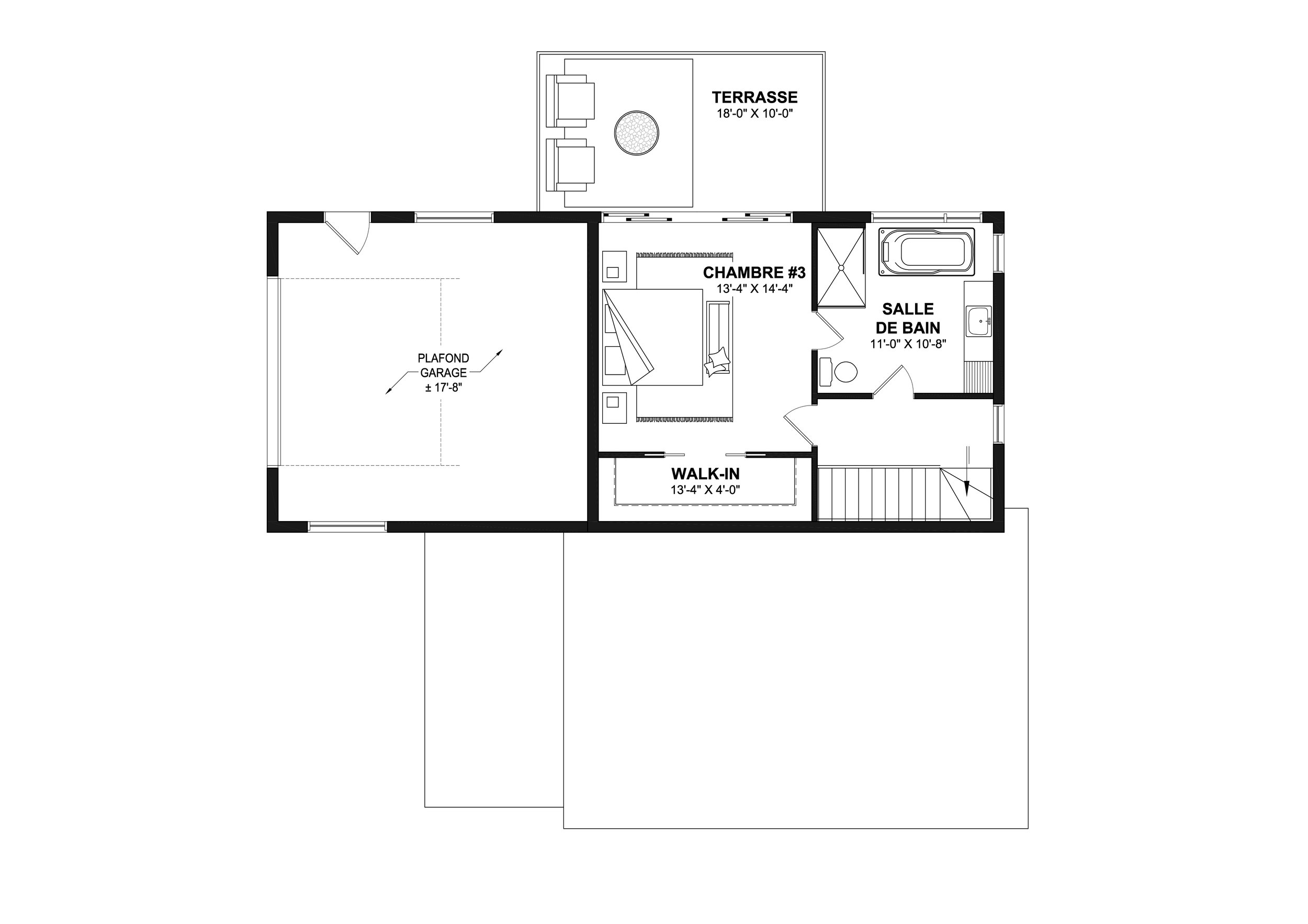 Si une pièce boni ou un rangement boni est prévue à l'étage du garage, il est inclus dans le prix, qu'il soit accessible par un escalier standard ou escamotable. Cependant, les pieds carrés ne sont pas inclus aux pi² de l'étage ou de la surface habitable totale.